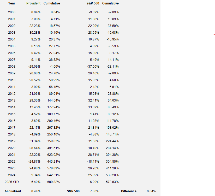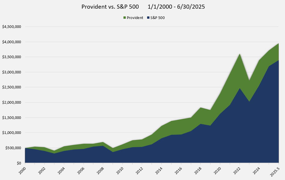 Provident’s investment performance includes all discretionary “core equity” accounts. The accounts included in this performance calculation represent 65% of Provident’s total assets under management as of 6/30/2025. Client accounts may be excluded from our composite calculation due to the presence of client-directed securities, client requirements that they approve transactions prior to execution, or the inclusion of securities that are not “core equities”. Performance prior to 2023 also excluded portfolios below our minimum requested size. We do not believe the inclusion or exclusion of these portfolios is material to our overall performance.